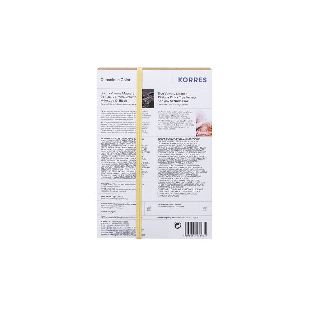 Korres Conscious Color Set – Drama Volume Mascara for Intense Length & Volume, 13ml & True Velvety Lipstick 13 Nude Pink, 3g (1 set)