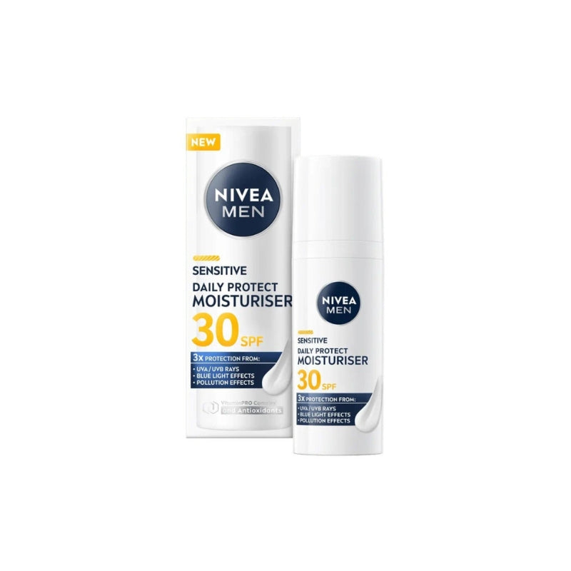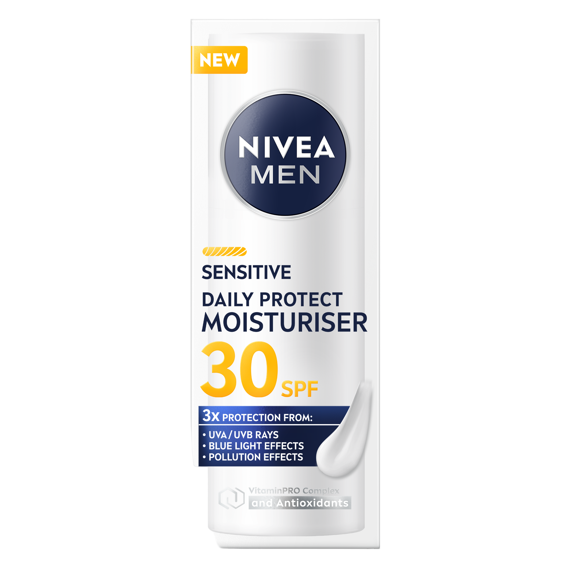 NIVEA MEN Sensitive Daily Protect Moisturiser SPF30 provides advanced care for sensitive skin with a triple protection formula. Enriched with the VitaminPRO Complex (Vitamin E and Provitamin B5) and antioxidants, this lightweight and fast-absorbing moisturiser shields your skin from UVA/UVB rays, blue light effects, and pollution. The non-greasy formula offers an immediate moisture boost, leaving your skin hydrated and healthy-looking all day. Specially designed for sensitive skin, it is dermatologically approved and can also be used after shaving for added protection. Apply daily to a cleansed face and neck for stronger, more resilient skin with long-lasting comfort.